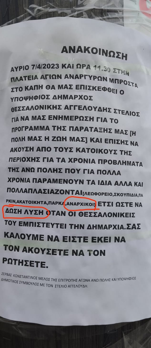 Πέρα από τα κραυγαλέα ορθογραφικά λάθη, ο συντάκτης και υποψήφιος δημοτικός σύμβουλος που τυχαίνει συνονόματος του εν ενεργεία δημάρχου, κ. Κώστας Ζέρβας, τονίζει ότι ένα από τα προβλήματα της περιοχής της Άνω Πόλης είναι οι αναρχικοί.