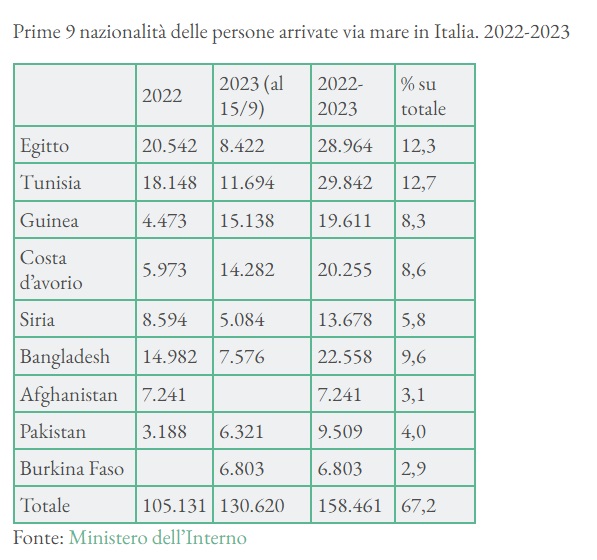 Λαμβάνοντας υπόψη τις πρώτες 9 εθνικότητες της καταγωγής των ανθρώπων που έφτασαν στην Ιταλία δια θαλάσσης το 2022-2023 (ίσο με το 67% του συνόλου – δείτε τον πίνακα που ακολουθεί), ένα μέρος προέρχεται από καθαρά εμπόλεμες ζώνες, όπως η Συρία και το Αφγανιστάν, ή με ισχυρή στρατιωτική ένταση, όπως η Μπουρκίνα Φάσο, ενώ το μεγαλύτερο μέρος προέρχεται από χώρες με δικτατορικές κυβερνήσεις όπως η Αίγυπτος, η Τυνησία, η Γουινέα, το Πακιστάν ή χαρακτηρίζονται από σοβαρές παραβιάσεις των ανθρωπίνων δικαιωμάτων, όπως το Μπαγκλαντές.