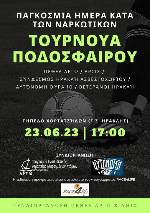 Στο πλαίσιο των εκδηλώσεων του ΠΕΘΕΑ “ΑΡΓΩ” για την Παγκόσμια Ημέρα κατά των Ναρκωτικών, την Παρασκευή 23/6 και ώρα 17:00 θα πραγματοποιηθεί τουρνουά ποδοσφαίρου στο γήπεδο Χορτατζήδων (Γ.Σ. Ηρακλής).