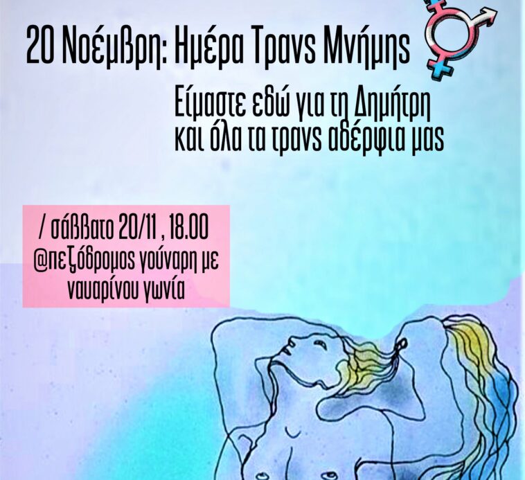 Συγκέντρωση το Σάββατο, 20 Νοέμβρη, στις 19.00 στον πεζόδρομο της Ναυαρίνου με Γούναρη γωνία διοργανώνει ο Ανοιχτός Συντονισμός Θεσσαλονίκης για τη Διεθνή Ημέρα Μνήμης Τρανς Θυμάτων. «Η φετινή 20η Νοέμβρη είναι για εμάς μέρα μνήμης για τη Δήμητρη από τη Σκαμιά της Λέσβου. Για ένα φωτεινό πλάσμα που έδινε μόνο αγάπη και φροντίδα και πριν φύγει από αυτόν τον κόσμο γνώρισε περιθώριο, χλευασμό και κακοποίηση. Κανένα άλλο να μη βιώσει όσα βίωσε η Δήμητρ@. Κανένα να μη μείνει μόνο του» τονίζεται στην ανακοίνωση του συντονισμού.