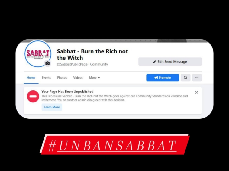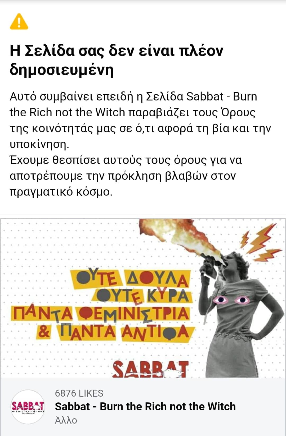 «Σήμερα 13/07 το Facebook έριξε τη σελιδά της συλλογικότητας Sabbat – Burn the Rich Not the Witch.