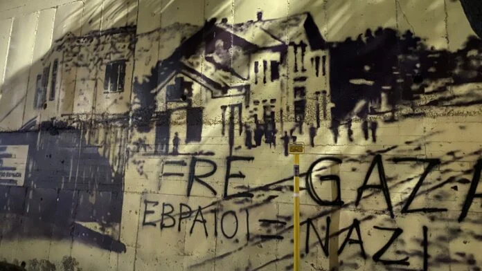 Άγνωστοι έγραψαν συνθήματα υπέρ του παλαιστινιακού λαού καθώς και αντισημιτικά συνθήματα σε όλο το μήκος της τοιχογραφίας.