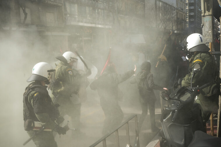 Στην καταστολή της πορείας των Φοιτητικών Συλλόγων της Θεσσαλονίκης προχώρησαν το μεσημέρι της Πέμπτης τα ΜΑΤ. Χτύπησαν την πορεία την ώρα που βρίσκονταν στη συμβολή των οδών Τσιμισκή και Αγ. Σοφίας, με αποτέλεσμα να τραυματιστεί από γκλοπ άνδρα των ΜΑΤ ένας φοιτητής στο κεφάλι. Στη φωτογραφία αποτυπώνεται η αναίτια και βίαιη επίθεση των ΜΑΤ κατά της πορείας των Φοιτητικών Συλλόγων ενάντια στο νομοσχέδιο για τα ιδιωτικά πανεπιστήμια.