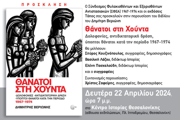 To επίκαιρο βιβλίο του Δημήτρη Βεριώνη “Θάνατοι στη χούντα – δολοφονίες, αντιδικτατορική δράση, ύποπτοι θάνατοι κατά την περίοδο 1967-1974” παρουσιάζεται τη Δευτέρα 22 Απριλίου 20234, ώρα 7 μμ, στην αίθουσα εκδηλώσεων του Κέντρου Ιστορίας Θεσσαλονίκης (πλατεία Ιπποδρομίου).