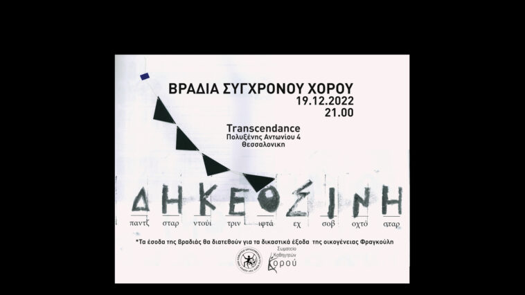 Καλλιτέχνες και καλλιτέχνιδες του σύγχρονου χορού της Θεσσαλονίκης θα αυτοσχεδιάσουν ή θα παρουσιάσουν αποσπάσματα δουλειάς τους με ζωντανή μουσική, σε μια βραδιά όπου τα έσοδα θα διατεθούν για την ενίσχυση στα δικαστικά έξοδα της οικογένειας Φραγκούλη.