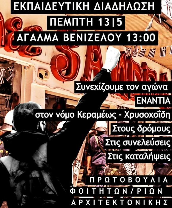 Στην πρώτη, μετά το Πάσχα, διαδήλωση καλούν σήμερα φοιτητές και φοιτήτριες ενάντια στο νομοσχέδιο Κεραμέως-Χρυσοχοΐδη. Στις 13.00 με σημείο συγκέντρωσης το Άγαλμα Βενιζέλου το φοιτητικό κίνημα ξαναβγαίνει στους δρόμους.