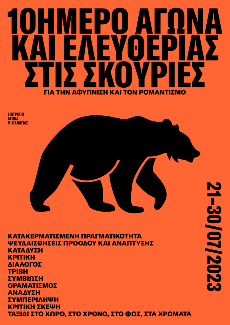 Από τις 21 μέχρι τις 29 Ιουλίου θα διαρκέσει φέτος το Δεκαήμερο Αγώνα και Ελευθερίας στις Σκουριές του όρους Κάκαβος της ΒΑ Χαλκιδικής. Το πρόγραμμα περιλαμβάνει συζητήσεις για την περιβαλλοντική καταστροφή, τη δημόσια υγεία και τους αγώνες που δίνονται στην Ελλάδα και στο εξωτερικό. Περιλαμβάνει ακόμη πολιτιστικά δρώμενα, προβολές, θέατρο και μουσική καθώς και ξενάγηση στους χώρους της καταστροφής.