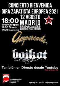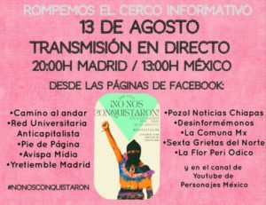 Άρχισαν και πραγματοποιούνται από τις 11 Αυγούστου οι εκδηλώσεις στη Μαδρίτη με τίτλο “Δεν μας κατέκτησαν – Δεν υποτασσόμαστε! 500 χρόνια από το ξεκίνημα της ιθαγενικής αντίστασης”. Οι ημέρες αυτές οργανώνονται από δεκάδες συλλογικότητες της Μαδρίτης και κοντινών περιοχών, που έχουν δικτυωθεί εδώ και μήνες και δουλεύουν σε θεματικούς άξονες με αφορμή τον ερχομό των Ζαπατίστας στην Ευρώπη- δείτε εδώ σχετικό βίντεο.